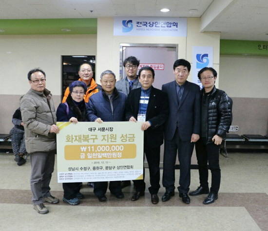 성남지역 상인들은 페이스북 등을 통해 대구 서문시장 화재 피해 복구 성금 모금 활동을 펴 22곳 전통시장·골목상점가가 동참하면서 닷새 만에 이번 성금을 마련했다.
