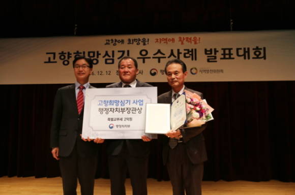 [프라임경제] 곡성군(군수 유근기)이 지난 12일 행정자치부에서 주관한 '고향희망심기사업' 우수사례 발표대회에서 우수기관으로 선정돼 특별교부세 2억원과 행정자치부 장관표창을 받았다고 밝혔다.