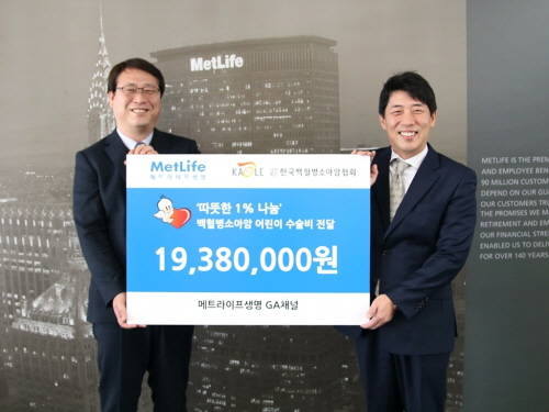 메트라이프생명은 10월 자사 GA채널에 모집된 누적 월납보험료의 1%를 기부하기로 했다. 이렇게 조성된 2000만원의 기부금은 한국백혈병소아암협회를 통해 백혈병 소아암을 앓는 소외계층 아동 수술비 지원에 사용된다.