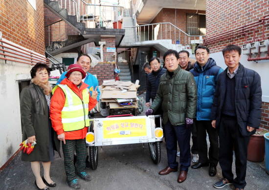 폐지 줍는 어르신들이 도로상에서 안전사고 위험에 노출돼 있어 대책을 마련해 보라는 정찬민 시장의 지시에 따라 처인노인복지관이 나선 것. 이에 복지관은 관련 업체에 특별제작을 의뢰했고, 안전장치가 부착된 손수레를 만들어 폐지 줍는 어르신 83명 중 중위소득 50% 이하 18명에게 전달했다.