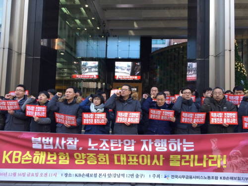 전국사무금융서비스노조는 16일 오전 11시 KB손해보험 본사 앞에서 기자회견을 열어 KB손보 노조 분회장에 대해 부서장과 감사부를 동원해 일거수일투족을 사찰한 뒤 징계를 내렸다고 주장했다.