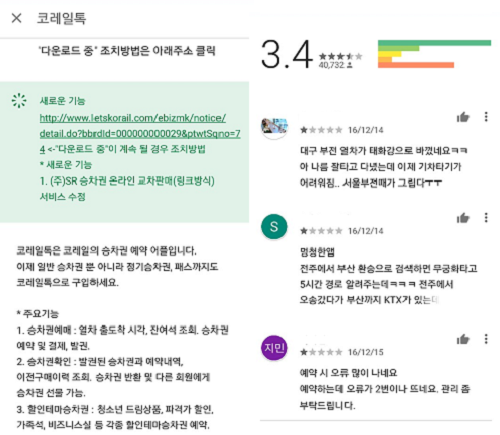 이러한 문제는 지금도 이어지고 있다. 지난 3일 한국철도공사는 코레일톡을 4.1.21 버전으로 업데이트하면서 SR 승차권 온라인 교차판매 서비스에 대한 오류를 수정했지만, 업데이트 시 다운로드 중이라는 문구만 뜬 채 실행이 안 되는 치명적인 오류가 발생했다.