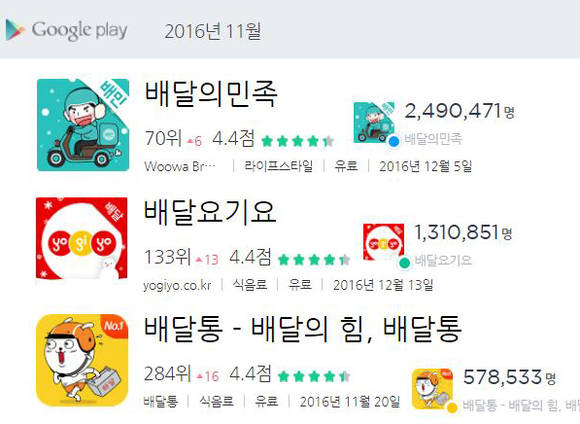 한편 와이즈앱이 발표한 지난달 기준 배달앱 월간 이용자 수는 '배달의민족'이 249만명으로 업계 1위를 기록했고 '배달요기요' 131만명, '배달통' 57만8500명 순이었다. 앱 충성도 역시 '배달의 민족'이 52.6%로 가장 높았고 '배달요기요' 40.2%, '배달통' 35.2%로 나타났다.