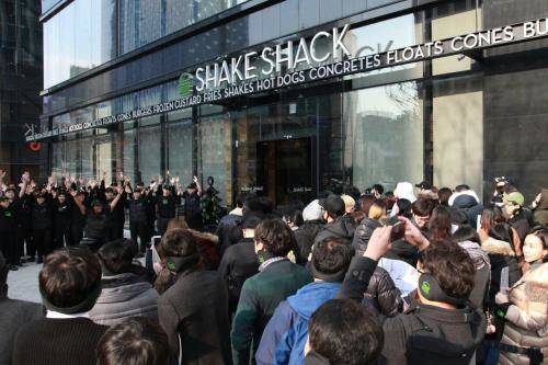 [프라임경제] SPC그룹이 17일 오전 11시 서울 도산대로에 쉐이크쉑 2호점 청담점을 오픈했다. 쉐이크쉑 직원들이 퍼포먼스를 진행, 소비자들이 줄 서서 입장을 기다리고 있다.