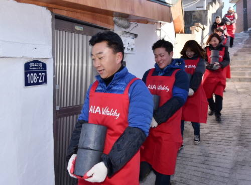 이날 행사는 '따뜻한 한반도 사랑의 연탄나눔 운동본부' 주관으로 서울 성북구 북정마을에서 진행됐다. 차태진 대표를 포함한 AIA생명 임직원 100여명은 연탄 1만8000장, 전기장판 60장, 쌀 60포대를 직접 배달했다. 또 지원금 2000만원도 기부했다.