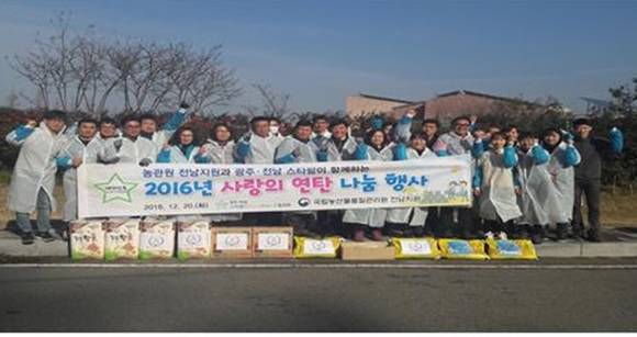 이날 김정빈 전남농관원장은 "경제 여건이 어려운 시기일수록 오히려 도움이 절실한 우리 이웃들이 소외될 수 있다"며 "비록 작은 정성이지만 도움의 손길이 필요한 분들이 따뜻한 겨울을 보낼 수 있었으면 좋겠다"고 말했다.