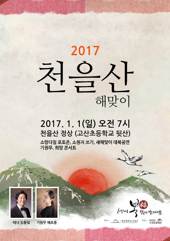 [프라임경제] 대구 수성구(구청장 이진훈)는 2017년(정유년(丁酉年), 붉은 닭의 해) 해맞이 행사를 오는 1월1일 오전 7시부터 천을산(고산초등학교 뒷산)에서 개최한다. 이날 지역 일출 시각은 오전 7시40분경이 될 전망이다.