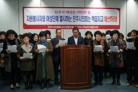 이날 해당 단체들은 "진주시의회가 올해 예산 93억원을 삭감한 것에 대해 분노한다"며 "자원봉사자와 여성단체를 멸시하는 시의원들의 자질이 의심되는 만큼 자리에서 물러나야 한다"고 주장했다.