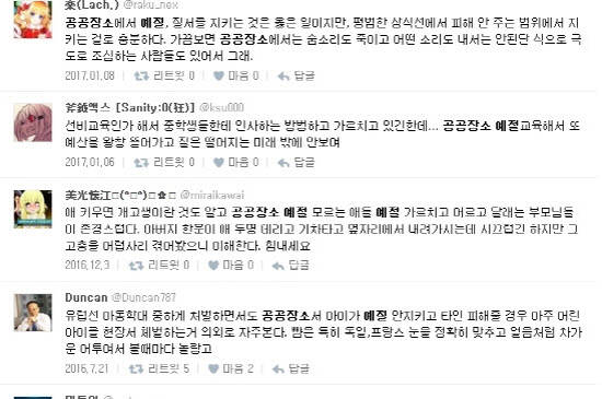 공공장소에서 프랑스나 독일인들도 애들 엉망으로 굴지 않게 체벌하면서까지 교육한다는 이야기부터, 공공장소에서 괜히 지나치게 애들 구박하지 말자는 이야기까지 스펙트럼이 대단히 넓었는데요.