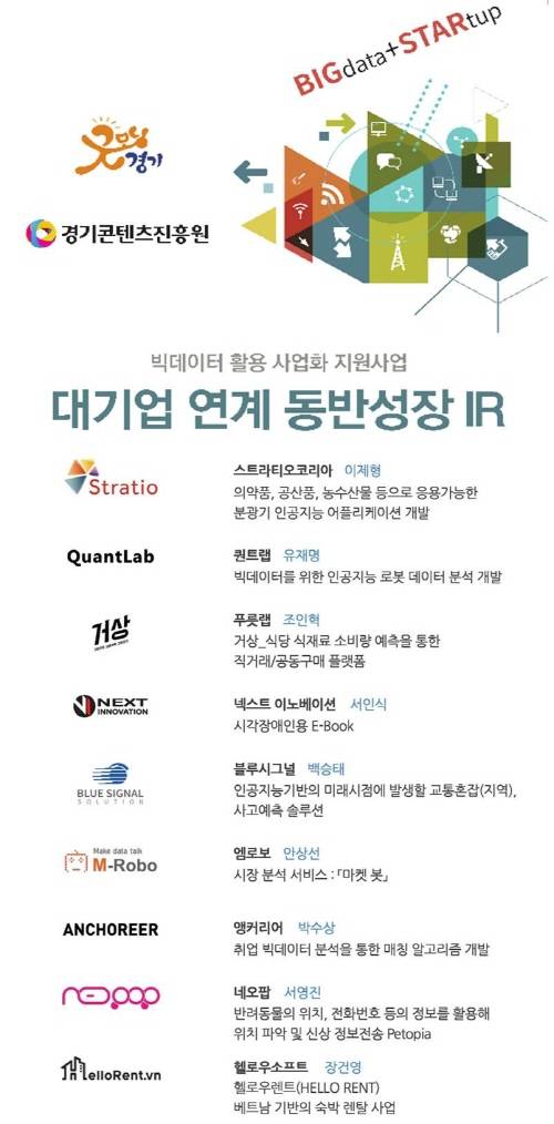 이번 IR에는 △스트라티오코리아(분광기 인공지능 앱 개발) △퀸트랩(인공지능 로봇) △푸룻랩(식재료 소비예측 구매플랫폼) △넥스트이노베이션(시각장애인용 E-Book) △블루시그널(인공지능 교통혼잡 및 사고예측 솔루션) △엠로보(시장분석) △앵커리어(취업 매칭 알고리즘) △네오팝(반려동물의 위치 등을 활용한 정보전송) 총 9개의 스타트업들이 참여한다.