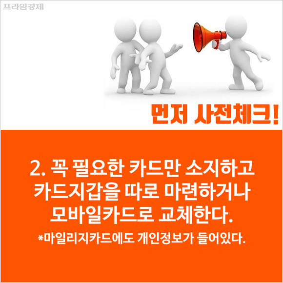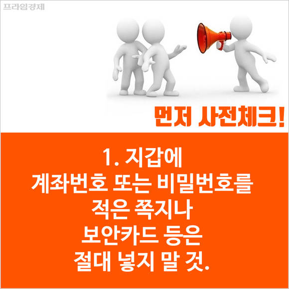 먼저 지갑을 잃어버리기 전에 조심하는 게 가장 중요하다. 절대 지갑 안에 계좌번호 또는 비밀번호를 적은 쪽지나 보안카드를 넣고 다니지 말아야 한다. 마트나 업체 마일리지카드의 경우 별 것 아닌 것 같지만 역시 개인정보를 담은 매체라는 것을 기억할 것.