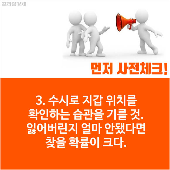 되도록 모바일카드로 교체하거나 카드지갑을 따로 마련하고 꼭 필요한 카드만 소지하는 게 좋다. 무엇보다 자리에서 일어나거나 이동 중에 수시로 지갑 위치를 확인하는 습관을 길러야 한다. 방금 잃어버렸다면 그만큼 찾을 확률이 크기 때문이다.