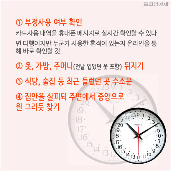 가장 먼저 할 일은 카드 부정사용 흔적을 확인하는 것이다. 사용내역을 휴대폰 메시지로 실시간 확인할 수 있다면 다행이지만 온라인을 통해 다시 한 번 확인한다. 다음은 전날 입었던 옷과 가방 주머니를 모두 뒤져보고 최근 들렀던 식당과 술집에 수소문하는 것이다. 또 집안을 살피되 주변에서 중앙으로 원을 그리듯 찾다보면 운이 좋을 경우 발견할 수도 있다.