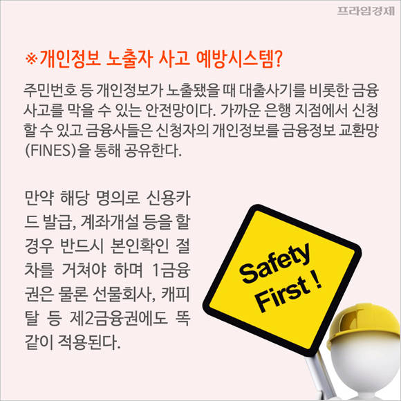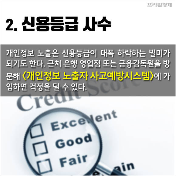 개인정보 노출은 신용등급이 대폭 하락하는 빌미가 되기도 한다. 금융사고가 걱정된다면 근처 은행 영업점 또는 금융감독원을 방문해 '개인정보 노출자 사고예방시스템'에 가입하는 게 좋다. 개인정보 노출자 사고 예방시스템은 주민번호나 계좌번호 등이 노출된 경우 대출사기 등 피해를 막아달라고 금융사에 요청하는 것이다.