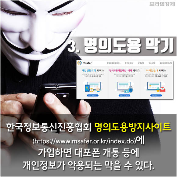 명의도용을 통한 일명 '대포폰' 개통을 막기 위해서는 한국정보통신진흥협회 명의도용방지사이트(https://www.msafer.or.kr/index.do)에 가입하면 된다. 이곳에서는 본인명의로 개설된 휴대전화, 인터넷 개통 이력도 확인할 수 있다.