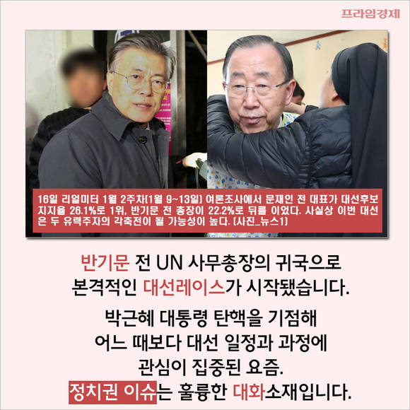 [프라임경제] 반기문 전 유엔사무총장의 귀국으로 본격적인 대선레이스가 시작됐다. 박근혜 대통령 탄핵을 기점으로 어느 때보다 대선 일정과 과정에 관심이 집중된 요즘 정치권 이슈는 훌륭한 대화소재다.