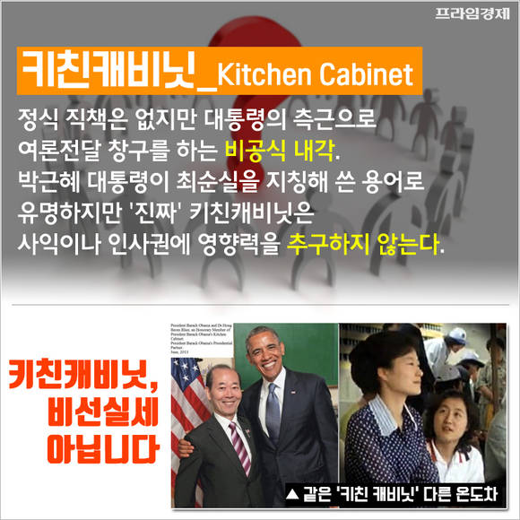 박근혜 대통령이 최순실을 지칭하며 쓴 용어로 유명해졌다. 정식 직책은 없지만 대통령의 측근으로 여론전달 창구를 하는 비공식 내각. 단 '진짜' 키친캐비닛은 사익이나 인사권에 영향력을 추구하지 않는다.