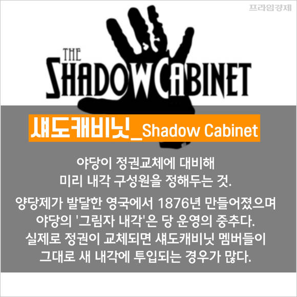 야당이 정권교체에 대비해 미리 내각 구성원을 정해두는 것. 양당제가 발달한 영국에서 1876년에 만들어진 제도로 야당의 '그림자 내각'은 당 운영의 중추 역할을 한다. 실제로 정권이 교체되면 섀도캐비닛 멤버들이 그대로 새 내각 구성원이 되는 경우가 많다.