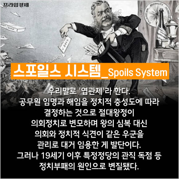 우리말로 '엽관제'라 한다. 공무원의 임명과 해임을 정치적 충성도에 따라 결정하는 것이다. 절대왕정에서 의회정치로 넘어가는 과정에서 의회가 왕의 심복들 대신 의회가 정치적 우군을 관리로 대거 임용한 것이 시초다. 그러나 19세기 이후 특정정당의 관직 독점 등 정치부패의 원인으로 변질됐다.