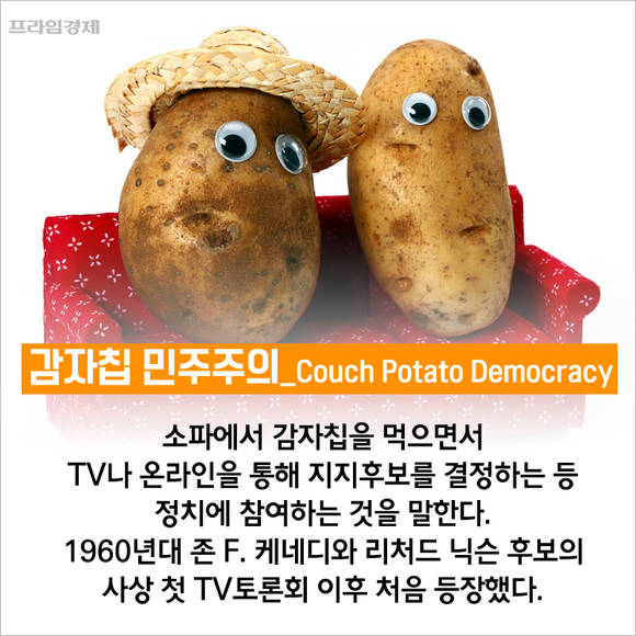 소파에서 감자칩을 먹으면서 TV나 온라인을 통해 지지후보를 결정하는 등 정치에 참여하는 것을 말한다. 1960년대 존 F. 케네디와 리처드 닉슨 후보의 사상 첫 TV토론회 이후 처음 등장했다.