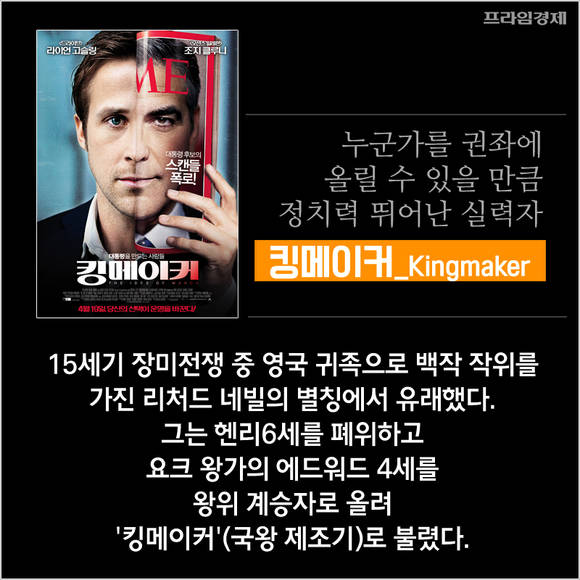 누군가를 권좌에 올릴 수 있을 만큼 정치력이 뛰어난 실력자. 15세기 장미전쟁 중 영국 귀족이자 백작 작위를 가진 리처드 네빌이 헨리6세를 폐위시키고 요크 왕가의 에드워드 4세를 왕위 계승자로 올려 '킹메이커'라는 별칭을 얻은 것에서 유래됐다.