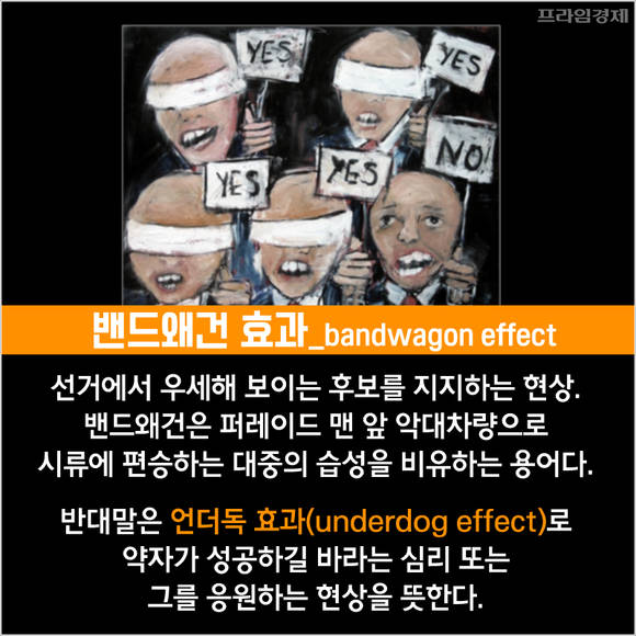 선거에서 우세해 보이는 후보를 지지하는 현상. 밴드왜건은 퍼레이드 행렬 가장 앞에 위치하는 악대차량을 뜻하며 시류에 편승하는 대중의 습성을 비유할 때 쓰이는 용어다. 반대말은 언더독 효과(underdog effect)로 약자가 성공하길 바라는 심리나 그를 응원하는 현상을 말한다.