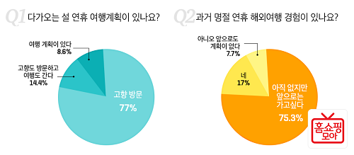응답자의 8.6%는 설 연휴를 이용해 여행을 갈 예정이라고 답했으며, 여행과 고향 방문 모두 계획한 응답자도 14.4%를 차지해 총 23%가 여행 계획이 있는 것으로 조사됐다. 이들의 여행지는 국내 여행이 65.3%, 해외여행이 34.7%였다.