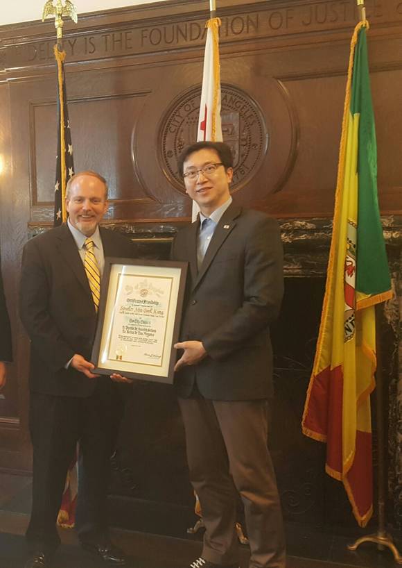 [프라임경제] 경남도의회 운영위원회 부위원장 강민국 의원은 지난 21일 미국 LA를 방문해 캘리포니아주 케빈 드리온 상원의장과 LA시의회 허브 웻슨 의장으로부터 감사장을 받았다고 23일 밝혔다.