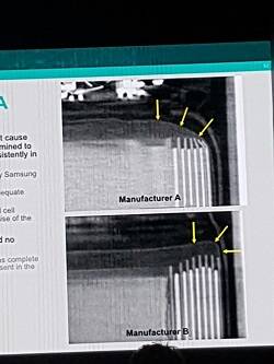 중국 ATL 배터리는 음극과 양극 탭을 부착하는 초음파 융착 과정에서 발생한 비정상적으로 큰 융착 돌기가 절연테이프와 분리막을 뚫은 것이 문제됐다. 양극과 음극 기재가 만나 발생한 단락 현상인 것으로 분석 결과 밝혀졌다.