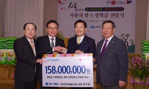 [프라임경제] 박수관 ㈜YC-TEC 회장이 지난해 추석에 이어 올해 설을 앞두고 고향 여수에 1억6000여만원 상당의 쌀과 장학금을 쾌척했다. 박 회장은 24일 시청에서 주철현 여수시장, 박정채 여수시의회의장 등과 함께 '설맞이 사랑의 쌀 및 장학금' 전달식을 가졌다.