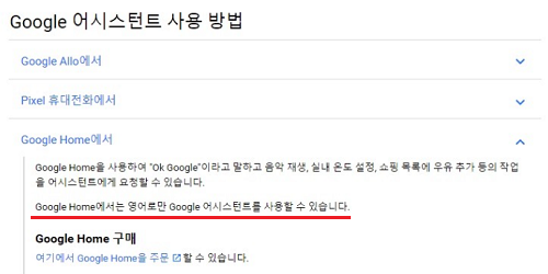 구글 홈페이지에도 'Google Home에서는 영어로만 Google 어시스턴트를 사용할 수 있습니다'라고 명시돼 있다.