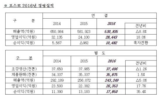[프라임경제] 포스코(005490)는 25일 컨퍼런스콜 형태로 2017년 기업설명회를 개최해 작년 연결기준 매출액 53조835억원, 영업이익 2조8443억원을 기록했다고 밝혔다.