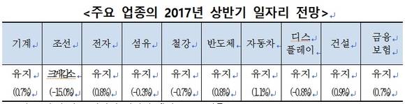 기계, 전자, 반도체, 자동차, 금융보험 등은 일자리 소폭 증가가 전망된다. 대외 설비투자 수요 증가로 호재가 예측되나, 중국의 자국 기업 육성정책 및 일본 제품과의 경쟁 심화, 브렉시트 가결 후 유럽의 자국 우선주의 정서 확산, 미국 금리 인상 및 세일오일 생산 등이 우려돼 0.7%(5000명)이 늘어날 것이라는 진단이다.