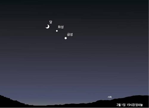 [프라임경제] 2월1일 저녁 서쪽 하늘에 달과 화성, 금성이 일렬로 늘어서는 천문현상이 일어난다.