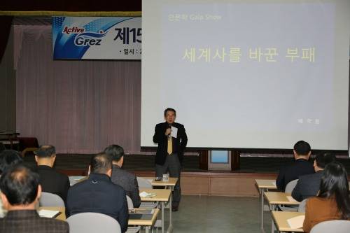 1일 광양경제청이 조직의 혁신역량 강화와 청렴도 향상을 위해 개최한 이날 회의에서 초청 강사로 나온 배국환 전 기획재정부 2차관이 '세계사를 바꾼 부패'라는 주제로 관료조직이 혁신해야 하는 당위에 대한 강의를 했다.