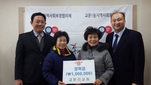 한편 교문1동 지역사회보장협의체는 2017년 복지특화사업의 하나로 경제적 어려움을 겪고 있는 저소득 가구의 중·고·대학생 자녀들이 꿈과 희망을 가지고 학업에 전념할 수 있도록 2월중 장학금과 장학증서를 전달할 예정이다.