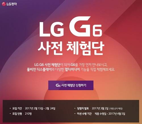 LG G6 사전 체험단 응모는 24일까지 LG전자 홈페이지(bit.ly/LG_G6_Trial_Group)에서 가능하다.