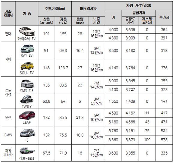 전기차 보조금 지원 대상 차종은 현대 아이오닉, 기아 레이, 쏘울, 르노삼성 SM3 Z.E, 트위지 등이다. GM 볼트(BOLT)는 보조금 지급 대상 평가를 통과했으나 국내 출시 이전으로 출시 이후부터 보조금 신청이 가능하다.