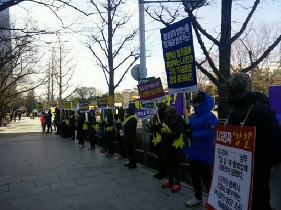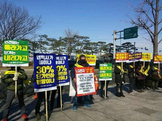 [프라임경제] 미광전자 임직원들이 17일 오전11시부터 LG트윈타워 앞에서 '협력사 임가공비 떼어먹는 LG전자(066570) 구미 TV공장은 갑질 중단하라'며 시위하고 있다. 지난 10일에 이어 두 번째다.