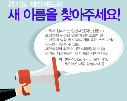 경기도는 19일 '경기도 제안제도 브랜드 네이밍 공모'를 2월20일부터 3월10일까지 경기도 아이디어 나눔카페 '트위그(http://cafe.naver.com/gideain)'를 통해 공고한다고 밝혔다.