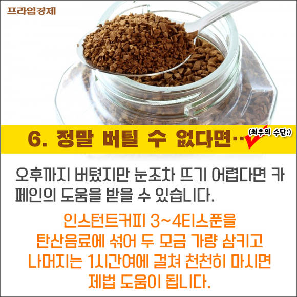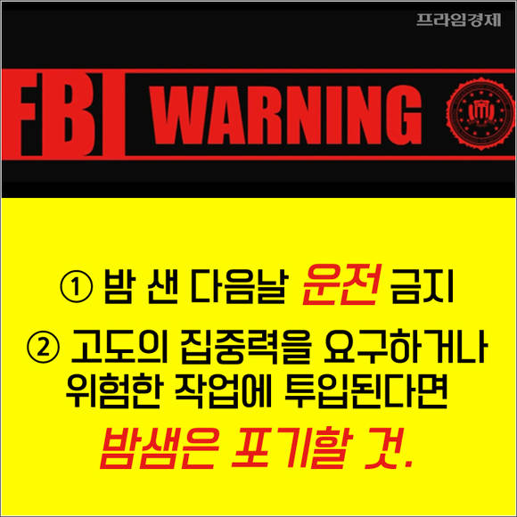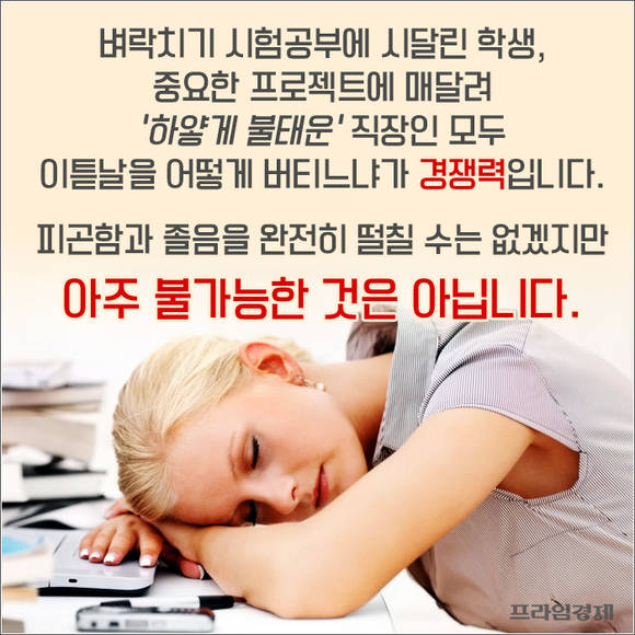 [프라임경제] 벼락치기 시험공부에 시달린 학생, 중요한 프로젝트에 매달려 '하얗게 불태운' 직장인 모두 이튿날을 어떻게 버티느냐가 경쟁력이다. 피곤함과 졸음을 완전히 떨칠 수는 없겠지만 아주 불가능한 것은 아니다. 밤샘피로를 버틸 수 있는 여섯 가지 방법을 정리했다.