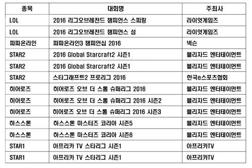 지난해 개최된 대회로는 △리그오브레전드 챔피언스 스프링 △리그오브레전드 챔피언스 서머 △파파온라인3 챔피언십 △글로벌 스타크래프트2 리그 시즌1 △글로벌 스타크래프트2 리그 시즌2 △스타크래프트2 프로리그 △히어로즈 오버 더 스톰 슈퍼리그 시즌2 △히어로즈 오브 더 스톰 슈퍼리그 시즌3 △하스스톤 마스터즈 코리아 시즌5 △하스스톤 마스터즈 코리아 시즌6 △아프리카TV 스타리그 시즌1 △아프리카TV 스타리그 시즌2 등 총 13개다.