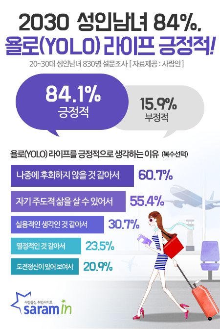 21일 취업포털 사람인(대표 이정근)이 20~30대 성인남녀 830명을 대상으로 '욜로(YOLO) 라이프 스타일에 대한 생각'을 조사한 결과, 84.1%가 '긍정적'으로 생각한다고 답했다.
