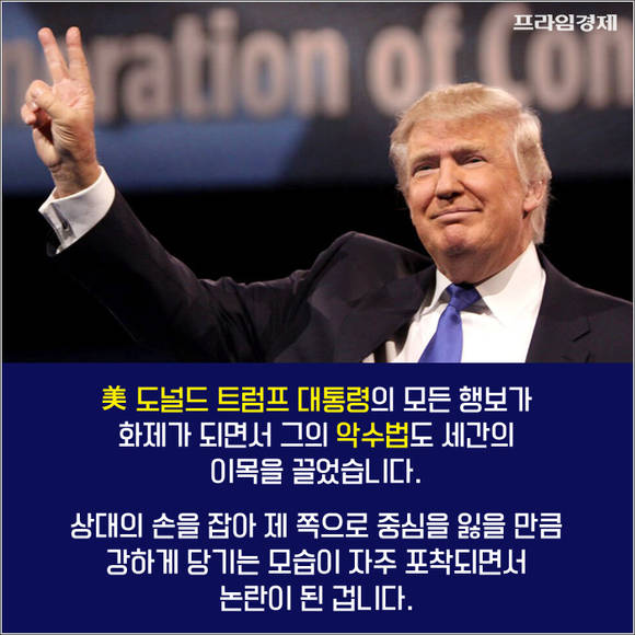 [프라임경제] 미국 도널드 트럼프 대통령의 모든 행보가 화제가 되면서 그의 악수법도 세간의 이목을 끌고 있다. 상대의 손을 잡아 제 쪽으로 중심을 잃을 만큼 강하게 당기는 모습이 자주 포착되면서 논란이 된 것이다.