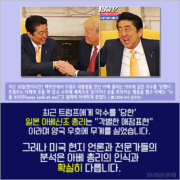 최근 트럼프에게 악수를 '당한' 일본 아베 신조 총리는 '각별한 애정표현'이라며 양국 우호에 무게를 실었지만 미국 현지 언론과 전문가들의 분석은 아베 총리의 인식과 확실히 다르다.