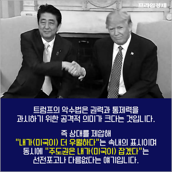 트럼프의 악수법은 자신의 권력과 통제력을 과시하기 위한 공격적 의미가 크다는 것이다. 즉 상대를 제압해 제 쪽으로 강하게 끌어당긴 것은 '내가(미국이) 더 우월하다'는 뜻임과 동시에 '주도권은 내가(미국이) 잡겠다'는 선전포고나 다름없다는 얘기다.