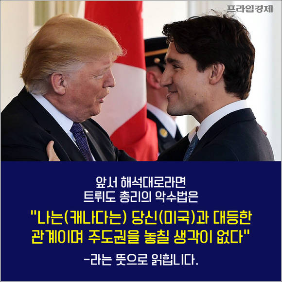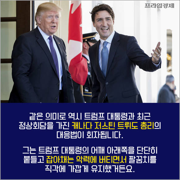 같은 의미에서 역시 트럼프 대통령과 최근 정상회담을 한 캐나다 저스틴 트뤼도 총리의 대응법이 회자됐다. 트뤼도 총리는 트럼프 대통령의 어깨 아래쪽을 단단히 붙들고 잡아채는 악력에 팔꿈치를 직각에 가깝게 유지하며 버텼다.
