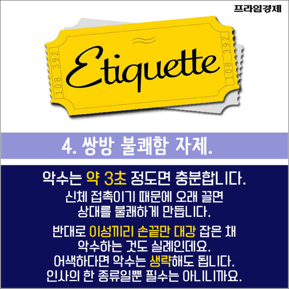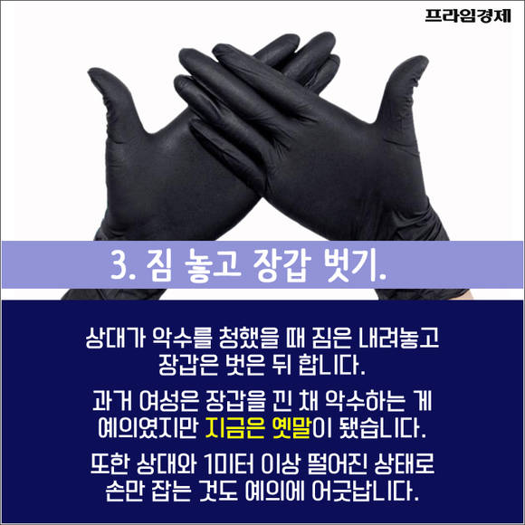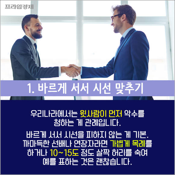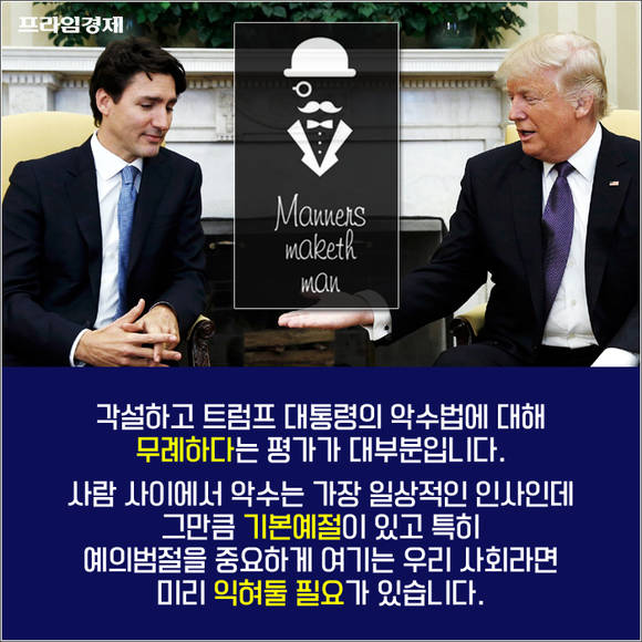 각설하고 트럼프 대통령의 악수법에 대해 무례하다는 평가가 대부분이다. 정상회담뿐 아니라 사람 사이에서 악수는 가장 일상적인 인사 중 하나다. 그만큼 기본예절이 있고 특히 예의범절을 중요하게 여기는 우리 사회에서 미리 익혀둘 필요가 있다.