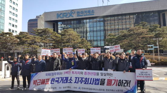 또한 "거래소 지주회사 전환에 따른 모든 비효율은 시장참가자에게 전가될 것"이라며 "가뜩이나 고사 직전이 증권산업은 사양화의 길로 접어들게 되고 증권노동자들은 마지막 생존권마저 박탈될 위기에 처할 것"이라고 말했다.