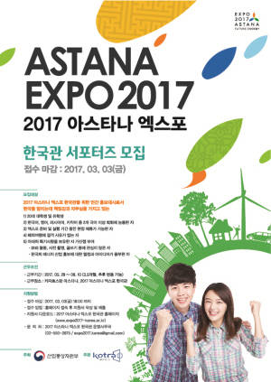 [프라임경제] 산업통상자원부와 코트라(KOTRA)는 '2017 아스타나엑스포 한국관'을 전 세계에 알릴 서포터즈를 선발한다.